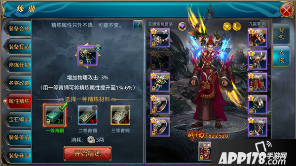 2.属性精炼材料分为:青铜(用于攻击装备上)和铁锭(用于防御装备上);