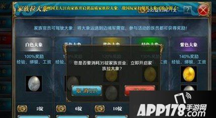 家族开启拉大象活动之后,家族成员需要押注一定的银子来进行活动的参与,押注的银子与大象颜色挂钩,奖励也不同,进行押注后,在拉大象活动结束后会获得一定数量的金蛋或者银蛋。金蛋有几率可获得100锭银子,紫色名将改造符,三等精炼材料等丰富奖励。