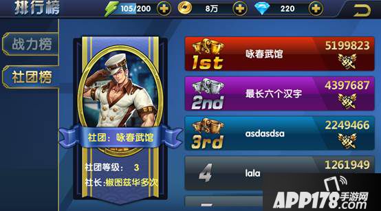 三、社团榜则是统计全服前20名社团总战力最高的社团(社团总战力等于社团所有成员战力之和)。同样在排行榜旁边的人物框只能显示战力是第一名的社团信息。