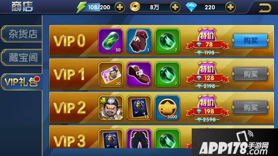 三、VIP礼包:VIP礼包的标签页包含16种礼包,除了15个VIP级别分别对应的礼包外还有一个VIP0的礼包。该礼包是指充值金额没有达到VIP1或者没有充值的玩家也可以购买的VIP礼包,只需要花费相应数值的钻石即可。VIP礼包是固定永久不变,不同杂货店和藏宝阁可以刷新的。