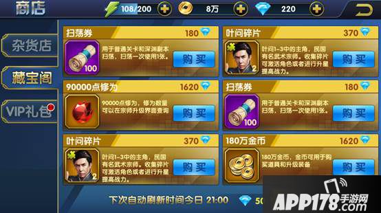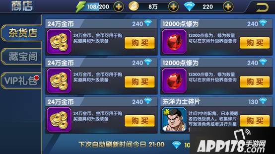 二、藏宝阁:藏宝阁中的商品都是需要钻石购买,但是获得物品的数量是杂货店的多倍。并且在藏宝阁中可以刷新出紫色品质和金色品质的宗师碎片,是玩家获得高级宗师的一个渠道。同时除了系统每天固定时间刷新商品外,玩家可以自动花费50钻石刷新。