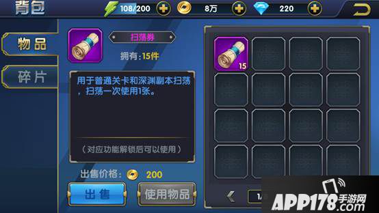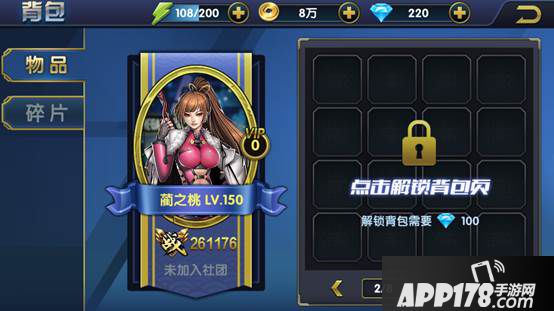 二、主界面的背包是存放游戏各种道具、礼包和主角与宗师碎片的背包,该背包只有物品标签页,有8页背包格。