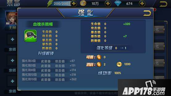 在装备界面中切换到强化页面,点击装备后面的强化会弹出该装备强化界面。强化装备需要消耗一定数值强化石和金币,随着强化等级的提高强化的成功率越低。每次强化会增加相应数值属性,当强化等级达到相应等级后会获得额外属性加成。