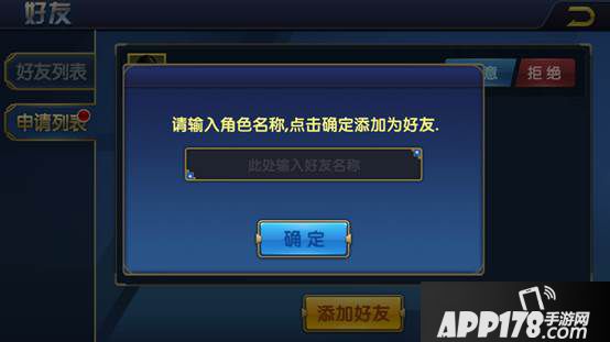 二、在上方图中有一个功能键“添加好友”,点击后会弹出添加好友界面。输入你认识的玩家昵称并确定,即可向该玩家提出添加好友申请。
