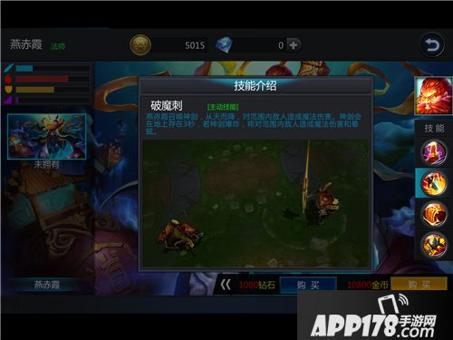 【破魔刺】1技能。燕赤霞召唤神剑,从天而降,对范围内敌人造成魔法伤害。神剑会在地上存在3秒。这是燕赤霞前期主要的伤害技能,引爆神剑会造成大量伤害,需要控制好神剑的落点。