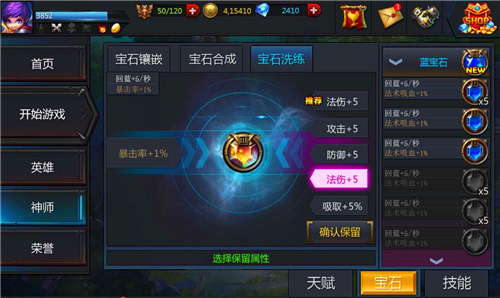 如果神师们觉得宝石属性不够多样性的话,还可以通过洗炼为一颗三级宝石附魔一种额外的特殊属性,将三级宝石放置于洗炼栏中,花费一些金币或钻石就可以获得一个附送的属性,如图所示:(图片仅供参考示意)
