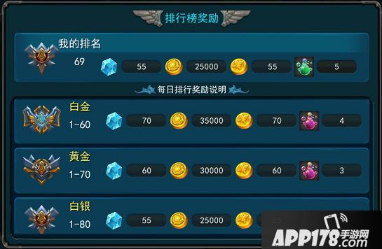 竞技场共分7个等级;分别为:新手、青铜、白银、黄金、白金、传说、王者。随着榜单的提升获得的对应奖励也会随之增加。