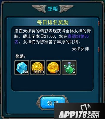 竞技场天梯女神还在会每日的21点,根据您当天在竞技场里当前的排名,每天定时发送对应奖励,玩家次日可通过游戏内邮箱查看并领取奖励。