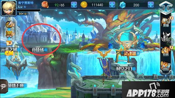 竞技场是玩家与玩家之间检验自身实力的地方,战斗刺激程度远远要高于关卡。图中红圈内的建筑即为竞技场,玩家等级到达10级后即可开启。战斗胜利后排名比历史排名高的都会有钻石奖励,但是只有一次;超越的排名越高,获得的钻石奖励也就越多。前期钻石供不应求,是钻石获取很好的途径。