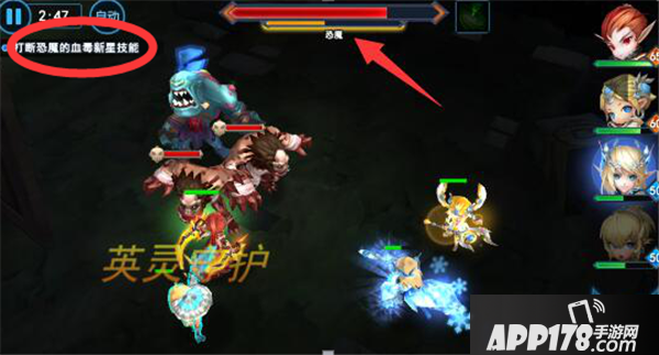 2.剩下来就是瓦尔基莉的展示时间了,如上图箭头所指,瓦尔基莉的打断技能将在这里发挥到极致(记住这关从boss施放第二个大招开始打断)。当血量下面的黄色能量条在蓄力的时候,一定要点击瓦尔基莉的大招,所以适当存留能量值是必要的。大招施放时间点很重要,可以参考小编截图上黄色能量条到达该位置时,点击施放瓦尔基莉的大招,不可以忽视的是施放大招前如果还有小怪存活记得先锁定好目标再施放大招。就这样一直打断下去,相信你可以通过自己的能力三星过关的。