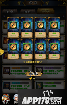 乾坤袋抽奖和开宝箱拿钱。乾坤袋可是个好东西,绝对的物超所值,如果挂机掉落了乾坤袋,千万别错过。花费少量元宝就可以有几率获得大量的资源和铜钱,绝对爽爆了。