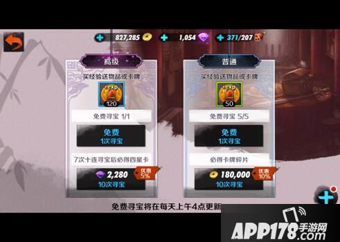 在主界面的右下角能看到一个寻宝宝箱,打开之后就能寻宝了。玩家每天有一次高级寻宝和五次普通寻宝的机会,普通寻宝有时间间隔,十分钟抽取一次。寻宝能获得各种物品或者卡牌碎片,每抽一次系统会发放升级卡牌用的经验。