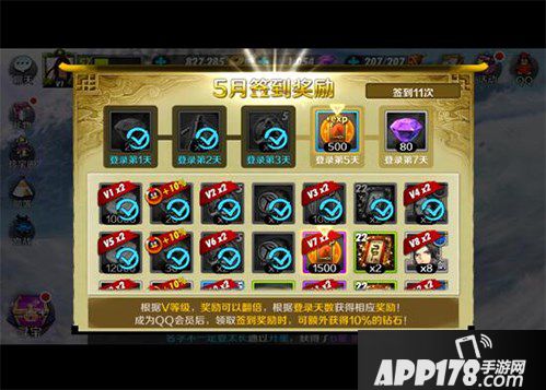 每天登陆游戏做的第一件事当然就是先签到啦。签到界面是登陆之后自动跳出来的,所以不用担心会忘记。每天登陆都会有相应的奖励,这是轻松获得金币、钻石、材料和碎片的一个途径。如果连续登陆的话还会有额外的奖励哦。
