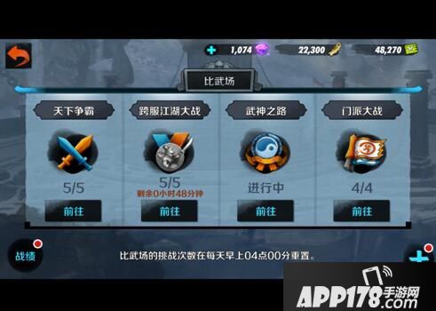 喜欢pvp的玩家当然不会忘记比武场。比武场内的玩法也有四种:一是天下争霸。选择其他玩家进行一对一的pk一次提升自己的排名,每天晚上十点的时候系统会根据排名发放相应的钻石和战斗牌奖励。