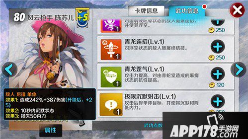 战斗吧剑灵中,陈苏儿是青龙堂中非常出色的一个枪手,陈苏儿的武功可以对敌人单体造成强大的物理伤害(后排4号),并且沉默敌人,沉默状态的角色10秒内无法释放任何技能,今天,小编就给大家带来8星陈苏儿的全面介绍。