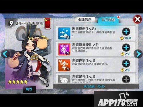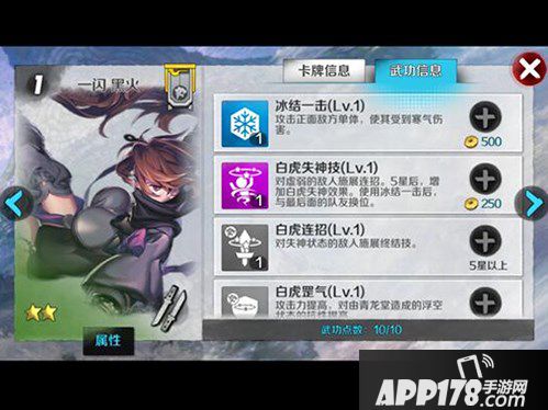 刺客,资质A,所需内力30,对虚弱状态的敌人施展连招,五星后增加失神效果并触发三段连招。碎片获得途径多,升星难度小。
