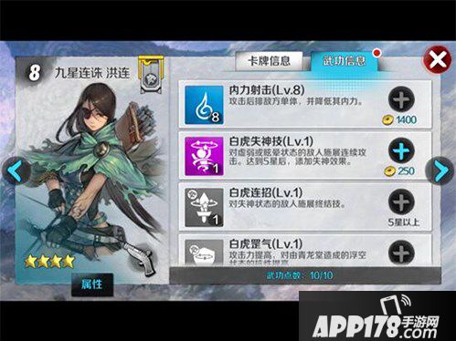 枪手,资质A,所需内力30,对晕眩和虚弱状态的敌人施展连招,五星后增加浮空效果并触发三段连招。碎片获得途径多,升星难度小。