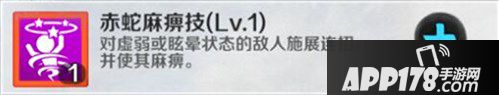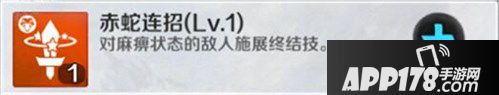 赤蛇堂QTE二段连击的起手技能,在敌人处于虚弱或眩晕状态时都可以释放,使敌人进入3秒麻痹的状态,这时属于赤蛇堂的卡牌都可以施展强大的终结技能,对敌人造成巨额伤害。但是这个技能主要用于QTE二段连击的起手,所以在升级的时候建议主升该技能。
