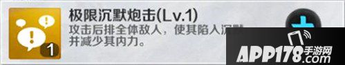沉默炮击的极限版,拥有比沉默炮击更高的攻击力和更为强大的控制效果,不仅让敌人在十秒内处于沉默状态,而且减少敌人50点内力,让敌人即使在沉默状态下恢复过来,依然需要一段时间恢复内力才能释放技能。建议在卡牌升到八星后,将升级后排炮击的技能点,转分配到极限沉默炮击上。