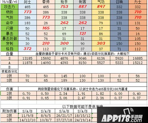 所有数据都是以等级75级,强化+5,星级6级为基础的,由于很多卡牌没有升级到75/+5/6星,所以是通过较低等级换算过来的,基本差不多的。