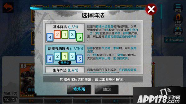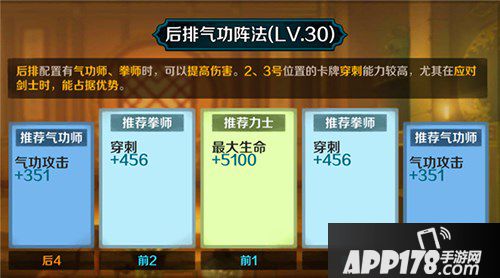 例如,当你的阵容是金刚罗汉、秦义绝、假小子火炮兰、洪玄公、狮王争霸华仲时,你就可以选择后排气功阵法来提高后排的气功输出