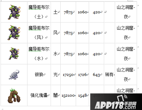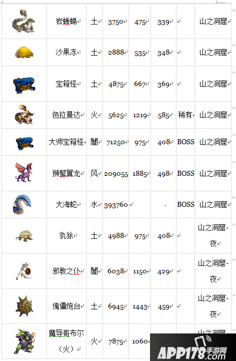 山之洞窟的怪物种类跟哥布尔村稍微有点相似,基本上以哥布尔、岩蜥蝪以及沙果冻为主。不过进入战斗的时候,有一定的机率会出现攻略难度比较高的鳄鱼兵以及稀有怪-色拉曼达。所以不太建议战力刚好适合攻略哥布尔以及岩蜥蜴的玩家来这里挑战。一但遇上鳄鱼兵基本上就完蛋了。