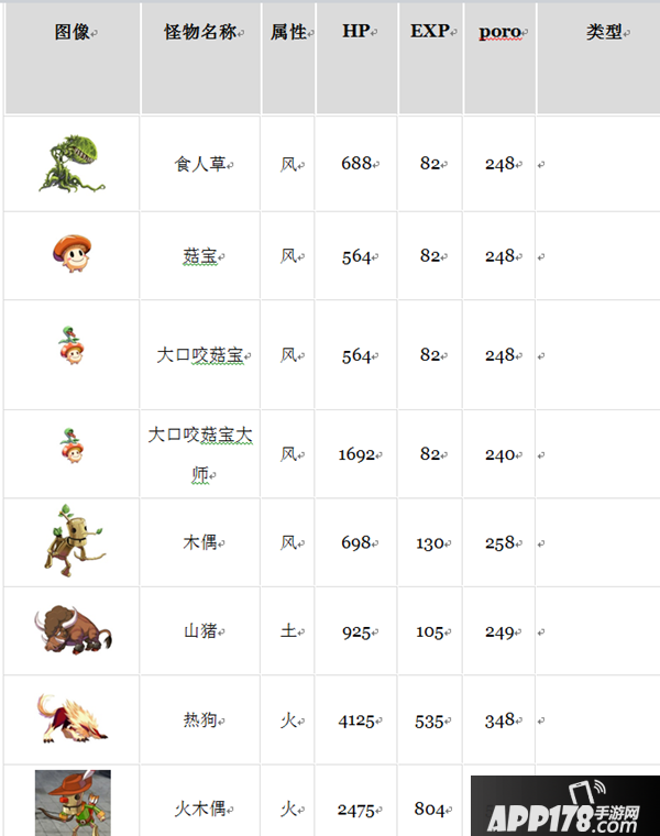 地图上登场的怪物,右侧区域分布的等级比较低。除了偶尔会突然冒出来的稀有怪-火木偶以及任务怪大口咬菇宝大师之外,几乎没有血量超过1000的敌人存在。