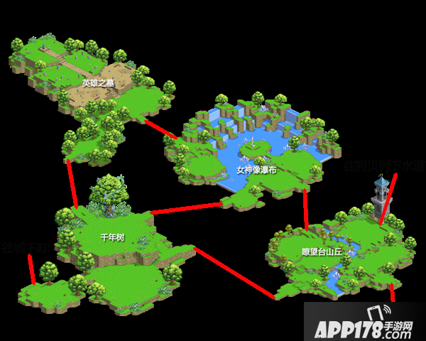 瞭望台山丘这张地图,中间被一条小河分隔成二个区域。地图中间有传送使可以将玩家传送到对岸,跟其他需要穿越其他地图的区域比起来,瞭望台山丘显得方便多了。