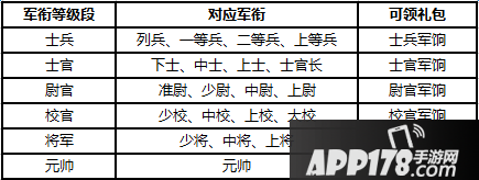 军衔分为6个等级段,20个等级,每周可以根据等级段领取礼包奖励,如下: