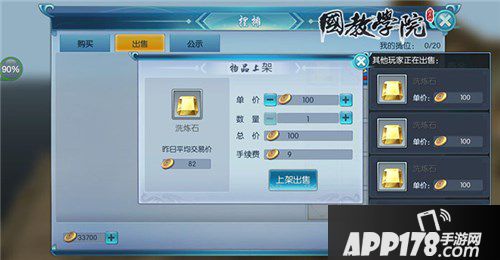 点击摆摊系统上部的“出售”按钮,就可以出售自己的可交易道具了。出售时系统会根据道具的平均售价给一个指导售价,如果高于或者低于指导价,系统会提示,另外交易过程中系统会收取9%的手续费。