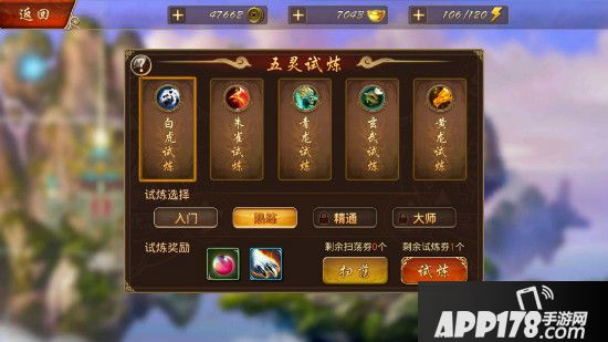 五灵试炼,顾名思义,一共需要通过五个副本的试炼,分别是【白虎试炼】、【朱雀试炼】、【青龙试炼】、【玄武试炼】、【黄龙试炼】。每个副本的玩法不同,奖励也不同,根据副本难度的提高,所获得奖励的品质也会更高,该试炼一天之内只能刷四次,也就是只能刷五个副本里的四个,当然你也可以选择重复刷一个。那么接下来就具体带大家去看看副本里的玩法详解吧,以“熟练”难度为例。