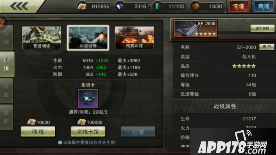 训练也是提高生命、火力、防御三个属性,每次训练加的属性不多,但好在集训卡多,每天都能点几下。现在重点来了,跟着我一起念:前20次训练是必成功的,前20次训练是必成功的,前20次训练是必成功的!所以,前期上阵的战机,不管三七二十一,都先训练个20次是绝对是没有错的。