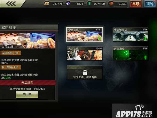 消耗军团贡献就可以提升军团科技,提升金币产出、生命、火力、防御等实用属性,每次升级提升的属性都不多,但架不住日积月累,对,一个强大飞机军团的壮大就从这里开始!
