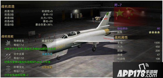 6号位:歼-7。紫机中的战斗鸡啊,有木有!有木有!即使你是非洲人,高级图纸研发也开不出这只战斗鸡,没事,分解低级图纸换也能换到,改造难度低。改造属性完美,此阵容的核心机。