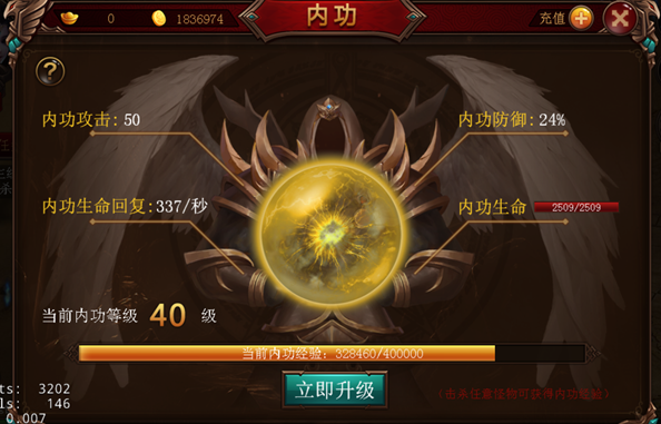 是不是觉得免疫30%以上的伤害非常厉害,我不会告诉你等级越高免疫伤害的比例越高哦!那么内功怎升级呢,您一定很想知道。内功可以通过获得内功经验来升级。内功经验获得的方式有多种多样哦,小编为您先介绍几个比较重要的途径: