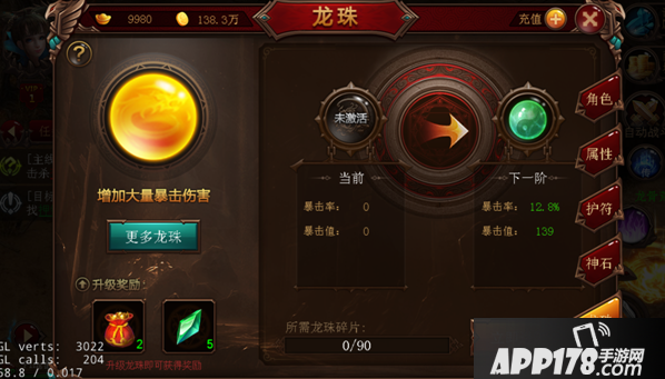 由于目前龙珠无法从游戏里的副本或boss直接爆到。战神传奇龙珠碎片的作用,就是供大家激活并升级龙珠装备。最低级的翼龙之心,只需要90个龙珠碎片即可激活。大家成功激活该龙珠后,就可以对其升级来提高龙珠的属性。目前战神传奇龙珠共有12个等级,随着等级的提升,龙珠的暴击率和暴击伤害都会越强,而升级所消耗的龙珠碎片数量会随之增多。每位玩家只允许佩戴一件龙珠,与其他装备一样,龙珠也可进行强化,获得强化属性。