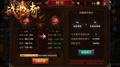 本次版本更新后,玩家转生等级可升至10级,不仅开放了战神、道尊、法圣9转武器衣服、10转套装,而且新增版本最强boss焚世魔龙,击杀后将掉落转生9阶、10阶套装,只等强者来战!高转生等级神装在刷BOSS时掉落,需要转生的小伙伴不可错失,提升装备即可获取大量战力值,战神路上更无敌!