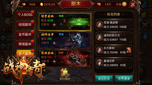 在新版本中,《战神传奇》首开组队副本,玩家可邀请兄弟一起进入副本,选择副本难度后可在世界频道邀请战友加入,由土城进入副本后,只需团结协作,抵挡15波小怪及战胜boss守卫战旗成功后,就会获得大量积分,可以在积分商店中兑换龙珠碎片、装备合成石、灵戒碎片等稀有道具。