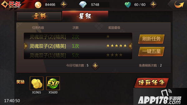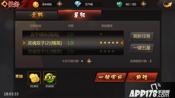 4.每日有2次免费刷新次数,玩家可以刷新出高星级的任务,多于2次以上可以消耗钻石购买。也可以消耗一定钻石一键刷新出5星任务。