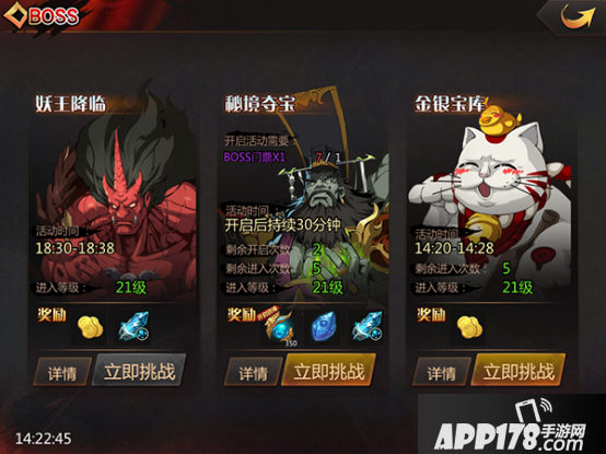 今天小编就来给小伙伴们聊一下世界BOSS的种类以及玩法介绍。世界BOSS在玩家达到21级的时候开放,分三种挑战模式:妖王降临、秘境夺宝、金银宝库。