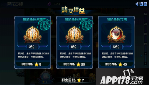 玩家在挑战对手胜利后会得到相应的五角星,根据敌手的挑战难度与胜利结算获得的五角星数量会有不同。五角星累计到一定数量后玩家可用五角星购买增益,增益是芦花古楼中较为独特的玩法之一,因为玩家爬上越高楼层遇到的对手会更加强大,购买增益可以提升玩家全体守护灵的暴击加成、攻击加成、全体防御等数值,从而提升胜利率。