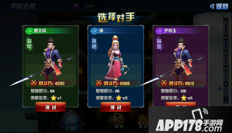 点击楼层的守卫将会出现选择对手界面,玩家可根据自己的战力挑战对手,最后进行布阵出战;挑战胜利后玩家可获得积分与五角星。达到一定积分可在芦花古楼界面中的“奖励”中领取金币、经验、守护灵碎片哦;五角星可用于玩家购买增益;
