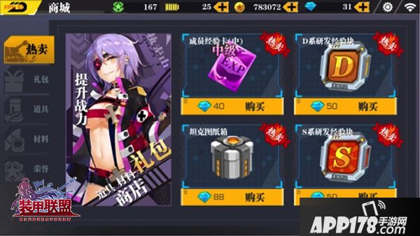 点击“主界面”右下角的商城按钮,在商城界面中选择“热卖或者材料”均可购买研发经验块。