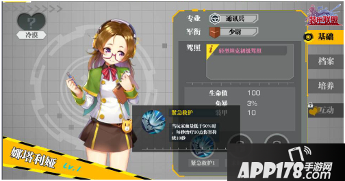 娜塔莉娅妹子的军衔是少尉,专业是通讯兵,初始人物属性是为您的坦克增加100点生命值、免暴增加3%、装甲增加10点。初始技能为紧急救护I,效果为当玩家坦克生命值低于50%时,每秒治疗10点伤害,持续10秒。