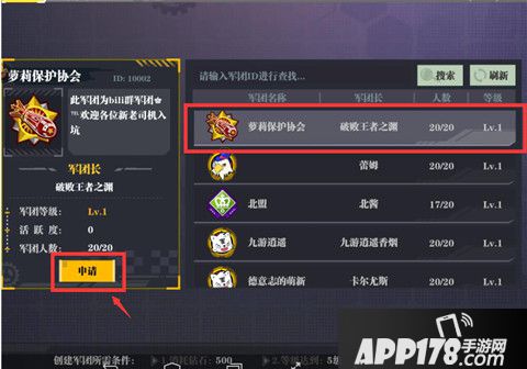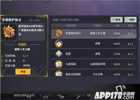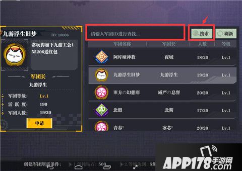 在军团界面上方输入军团ID进行查找,点击搜索即可找到指定的军团。选择该军团,点击申请即可申请加入。