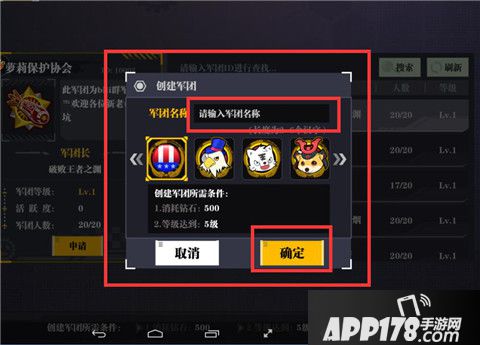点击“创建军团”后,输入军团名称,选择军团徽章后,点击“确定”即可。