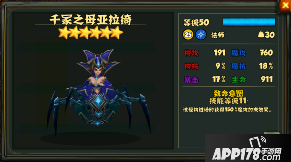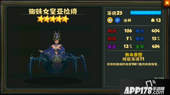 《战龙酒馆》中有好几只虫群女皇,这次先介绍大蜘蛛:蜘蛛女皇亚拉绮,这只大蜘蛛的被动技能很简单:初始被动技能是进场时获得100%魔攻加成,满级11级,可获得150%魔攻加成。