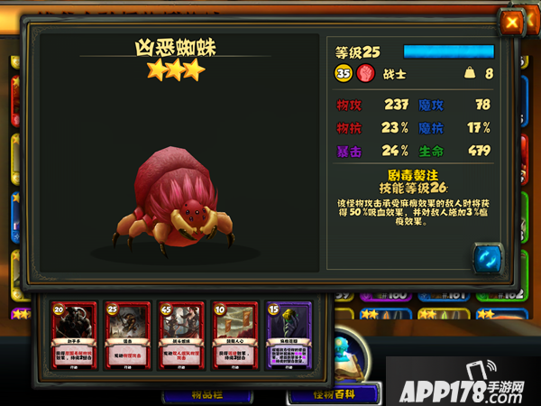 小蜘蛛的初始被动技能是攻击承受麻痹效果的敌人时将获得25%吸血效果,并对敌人施加1%的瘟疫效果。满级26级,可获得50%吸血并施加3%瘟疫效果。这个被动技能的发动需要其他怪物或者卡牌的配合,例如美杜莎,而且瘟疫这个debuff需要叠加才能充分发挥威力,可能这就是很少人用这类怪物的原因吧。