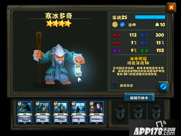 寒冰多奇,顾名思义,它的被动技能和牌组大多是以冰冻为主的效果,令对手无法行动。初始被动技能是回合开始时如果手牌数量低于对手,则获得持续1回合的范围霜冻护甲和15%的范围魔攻加成;被动技能满级16级时可获得30%的范围魔攻加成。注意:这里的buff都是范围的,可以为队伍提供相当有效的支持与帮助。