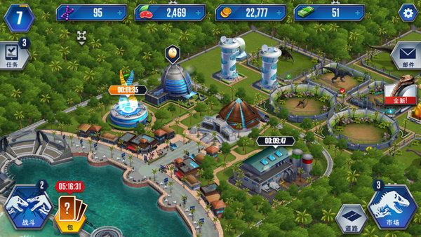 建筑物:各式各样的建筑物是玩家获取金币的主要来源,玩家可通过添置建筑物获得更多金币,也可长按建筑物将其移动到其他位置。不过,小编建议随着玩家等级的提升,可选择售卖一些落后建筑物,毕竟侏罗纪公园的发展也需要更新换代!